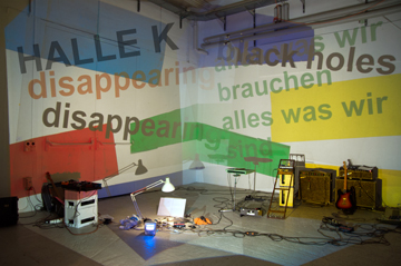 HALLE K wurde 1984 in der leerstehenden Fabrikhalle "K" der SUN in Bürglen (TG) gegründet. Marcel Hollenstein mit überfliessenden Texten am Mikrofon und Karl Steffen mit schrägen Projektionen führen das Projekt seit damals weiter. HALLE K inszeniert in wechselnder Besetzung live Auftritte in denen Performance, Aktionen, Projektionen, Licht und Feuer eine ebenso wichtige Rolle spielen wie Gesang, Tonband, Synthesizer, selbstgebastelte Noise-Instrumente und Gitarre. Seit 1991 legt Mario Marchisella mit dem Schlagbass und dem Octapad die Rhythmen aus und Holger Walther und Hannes Bissegger verdichten mit Geräuschen, Riffs und schillernden Effekten auf der Gitarre die aus Bild und Text heraufbeschworene Atmosphäre. Michele Elsener übersetzt auf Hellraum-Projektoren die momentane Stimmung in wandfüllende Zeichnungen. Kishana Kinashi erforscht, als Gast integriert ins Halle K Konzert, den Identitätsbegriff mit einer Aktion.