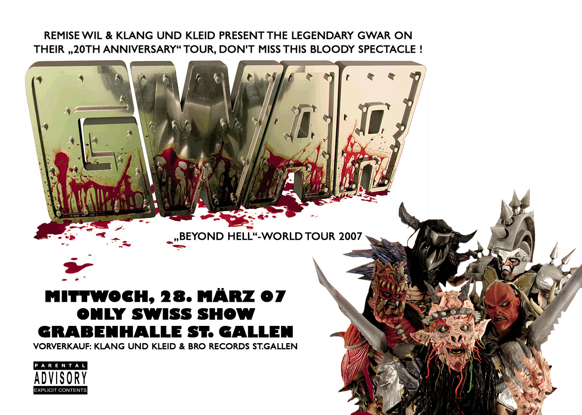 PresseAnlass: GWAR - Beyond Hell Tour 2007Typ: Konzert, Splatter / Monster-Show Musikstil: Heavy Metal Datum: Mittwoch, 28. März 2007 Ort: Grabenhalle, St.Gallen Vorverkauf: Klang und Kleid, St.Gallen & BRO Records, St.Gallen Spezielles: Regenpellerine oder weisses T-Shirt mitnehmen :) Nachfolgend einige der Bilder der GWAR für die Verwendung in der Berichterstattung über den Anlass vom Mittwoch, 28. März 2007. GWAR BilderWerden in Kürze hier publiziert.