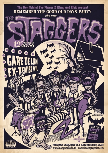 ![]() ![]() Plakat kaufen Remember The Good Old Days...Im Jahr 2004 sind 6 junge, wilde Garage-Trash-Surf-Maniacs aus dem Grazer Friedhof auferstanden. Sie infizierten die Alpenrepublik im Sturm und spielten schon 27. November, also im gleichen Jahr, in München am 11. jährigen Klang und Kleid Fest.So, be prepared for a wilde & insane garagepunk'n Beat & Twist nigth that will make you jump & shout at once! Their frontmen Wild Evel is one of thee most enthusiastic frontmen you can find in todays' beatcombos. See him acting like an ape on stage at Remise Wil, so you know what we talking about! Killer guitars & rhythm section combined with the swirling Farfisa organ sound produced by charming Lightning Iris. That will set you on fire within seconds!! It's raw, it's frantic, it's horifying, it's the Staggers!!!!