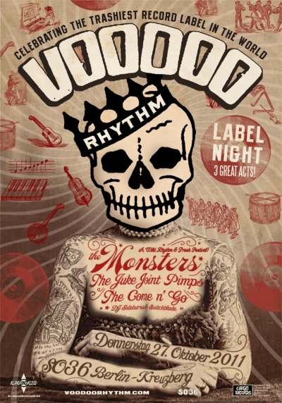Voodoo Rhythm Label NightDas Musiklabel Voodoo Rhythm Records aus Bern, steht seit 1992 für einen unabhängigen, kreativen Namen und veröffentlicht obskure, weit weg von Mainstream orientierte "back to the roots" Musik. Das Label ist heute ein international bekanntes Untergrund Label mit weltweiter Fangemeinde. Über die Jahre ist es zu einer Plattform für innovative Bands geworden und feiert schon bald das 20jährige Bestehen.BEAT-MAN kultivierte mit dem Label den so genannten "bad taste" des urchigen Rock'n'Roll. Seine Liebe galt schon immer der rebellischen Musik der 50er-Jahre. Voodoo Rhythm Records entstand im Umfeld seiner ersten Garage Punk Band The Monsters, welche in den Anfangszeiten erfolglos versuchte ihre eigenen Tonträger zu vertreiben. Nebst Bandleader und Labelmacher, ist Beat-Man ununterbrochen in diversen Voodoo Rhythm Bandformationen zu sehen und ist heute erfolgreicher Antiprediger des Gospel Trash Blues alias REVEREND BEAT-MAN. Nach nun mehr als 20jährigem Bandbestehen, melden sich The Monsters mit ihrem achtem Album diesen September zurück. Immer noch "the loudest feedback freak out band ever", kein bisschen schlauer, nur noch lauter! Die Band beendet ihre offizielle Record- Release Tour diesen Oktober mit verschiedensten lokalen Voodoo Rhythm Acts im Rahmen eines Labelnight- Wochenendes in den Städten Berlin-Paris-London.